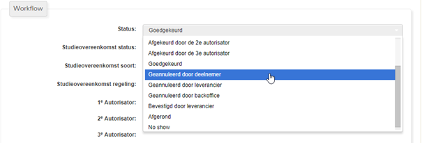 Klik in het veld of op het pijltje om de dropmenu te openen. Selecteer in de dropmenu de juiste status. Voor een annulering heb je de keuze uit drie opties: