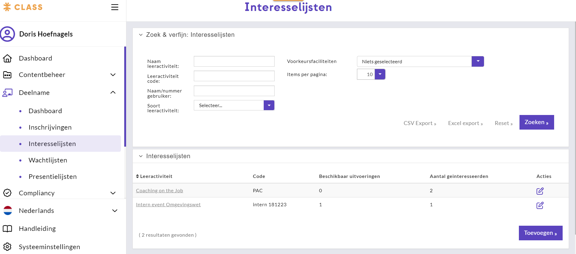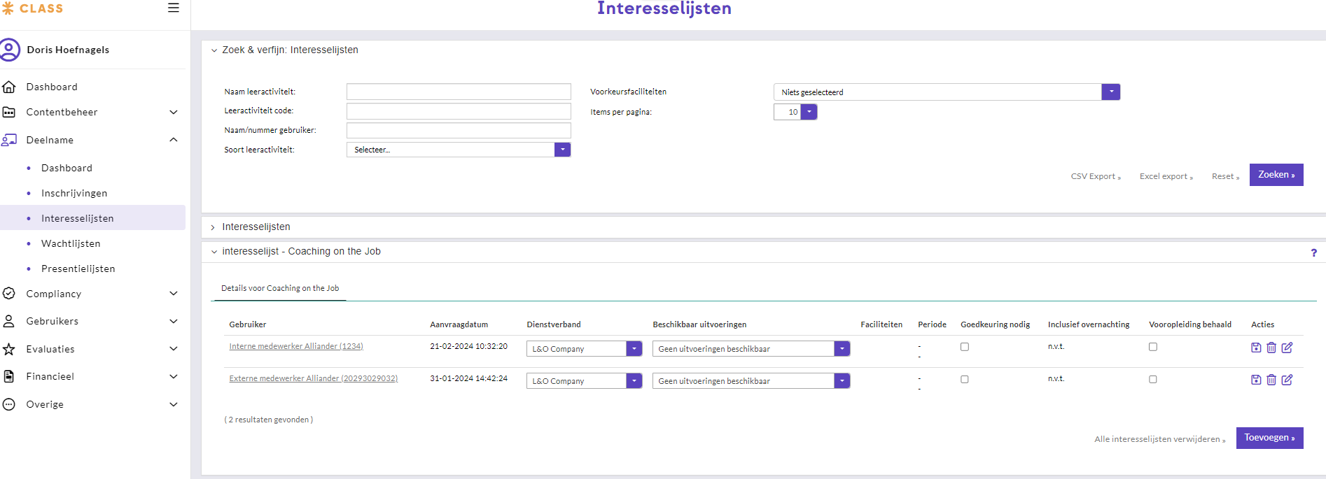 Klik in het volgende scherm op de knop ‘Toevoegen’ (linksonder) om een gebruiker op een interesselijst voor een leeractiviteit te plaatsen. In het pop-up scherm dat dan wordt geopend kunnen de gebruiker en leeractiviteit worden opgegeven via auto complete-velden.