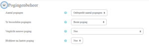 Onder pogingenbeheer kun je aangeven hoeveel pogingen een cursist mag doen, en welke poging telt voor de beoordeling: