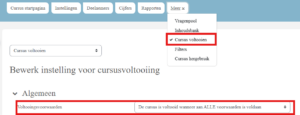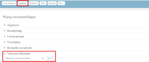 Voltooiing van de activiteit stel je in onder het kopje ‘voltooide activiteiten’. Je hebt de optie om geen voltooing bij te houden; m.a.w. de cursus zal nooit worden afgerond, of om voltooiing wel mogelijk te maken. Wanneer het niet nodig is om de activiteit te voltooiien, dan kies je bij ‘Instellingen ->voltooien bijhouden -> Bijhouden van voltooing inschakelen’ voor ‘nee’