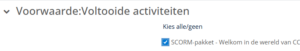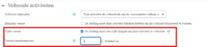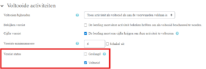 Daarnaast is het ook nog mogelijk om de activiteit te laten voltooien zodra deze de status ‘geslaagd’ of ‘voltooid’ heeft. Let op: in het SCORM-pakket zelf wordt ingesteld wanneer deze de status voltooid of geslaagd krijgt. Controleer dus altijd eerst hoe dit in het bestand zelf is ingereld, voor je bij de activiteit instelt dat deze geslaagd of voltooid moet worden.