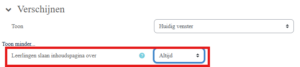 Onder het kopje ‘verschijnen’ heb je de mogelijkheid om aan te geven of de SCORM in een nieuw venster of in het huidige venster geopend moet worden: