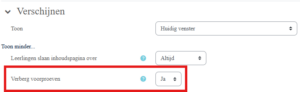 In de meeste gevallen is het niet nodig dat de cursist eerst langs de inhoudspagina van de SCORM moeten klikken. Kies daarom bij ‘Leerlingen slaan inhoudspagina over’ voor ‘Altijd’: