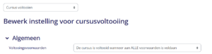 Zorg ervoor dat onder het kopje ‘algemeen’ de voltooiingsvoorwaarden zijn ingesteld op ‘De cursus is voltooid wanneer aan ALLE voorwaarden is voldaan’: