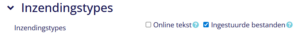 Bij ‘inzendingstypes’ geef je aan of de cursisten de opdracht kunnen inleveren als bestand, dat ze online een tekstveld kunnen invullen of beide: