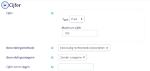 Onder ‘cijfers’ kun je instellen welk cijfer er behaald moet worden om de activiteit te voltooien. Vul bij maximumcijfer bijvoorbeeld 100 in, en als cijfer om te slagen 60: