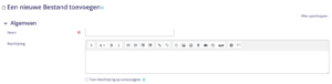Net als bij het toevoegen van een bestand, vul je nu de naam in en heb je de mogelijkheid om een beschrijving toe te voegen en deze te tonen. Daarnaast kun je, indien wenselijk, nog een bestand toevoegen met extra uitleg of achtergrondinformatie over de opdracht: