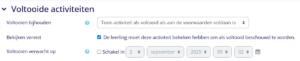 Stel vervolgens onder ‘voltooide activiteiten’ in wanneer de opdracht als voltooid kan worden beschouwd. Wanneer je de activiteit als voltooid wilt markeren op basis van bepaalde voorwaarden (bijvoorbeeld het cijfer), dan pas je deze instelling aan naar ‘toon activiteit als voltooid als aan de voorwaarden voldaan is’.