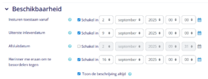 Onder het kopje ‘beschikbaarheid’ kun je desgewenst aangeven vanaf en tot wanneer cursisten hun huiswerkopdracht kunnen insturen. Ook heb je de optie om de opdracht helemaal af te sluiten of een herinnering voor beoordeling aan de docent te sturen: