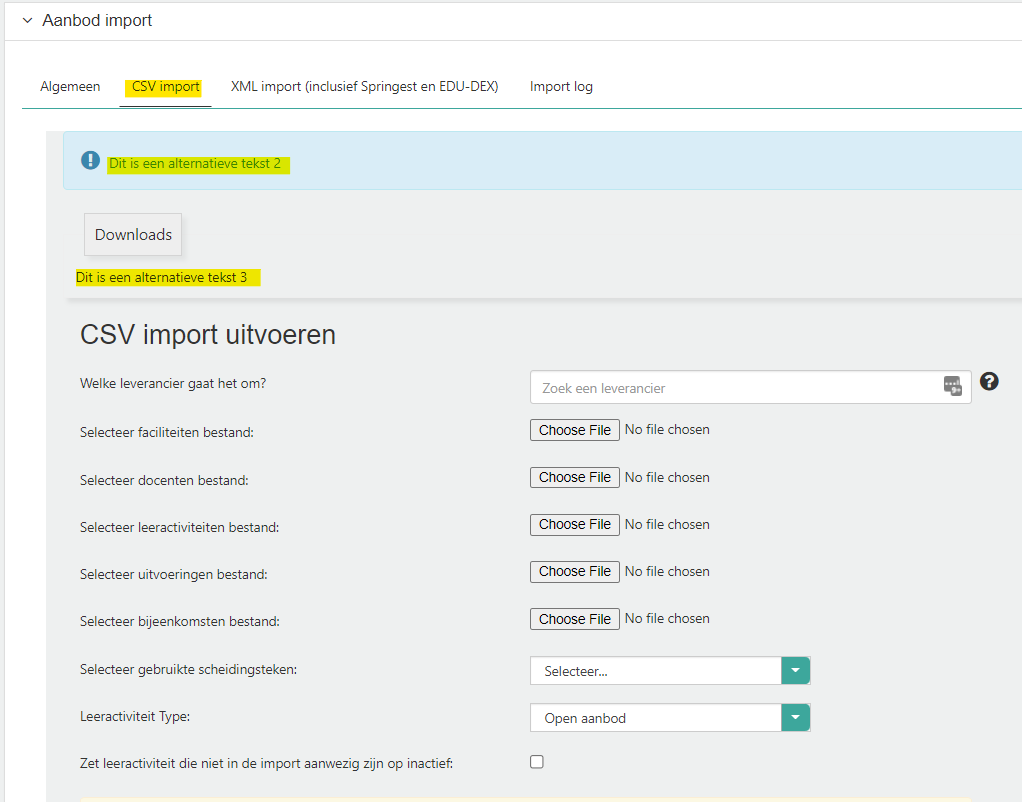 De alternatieve tekst wordt in het tabblad: ‘CSV import’ getoond direct onder ‘Downloads’.