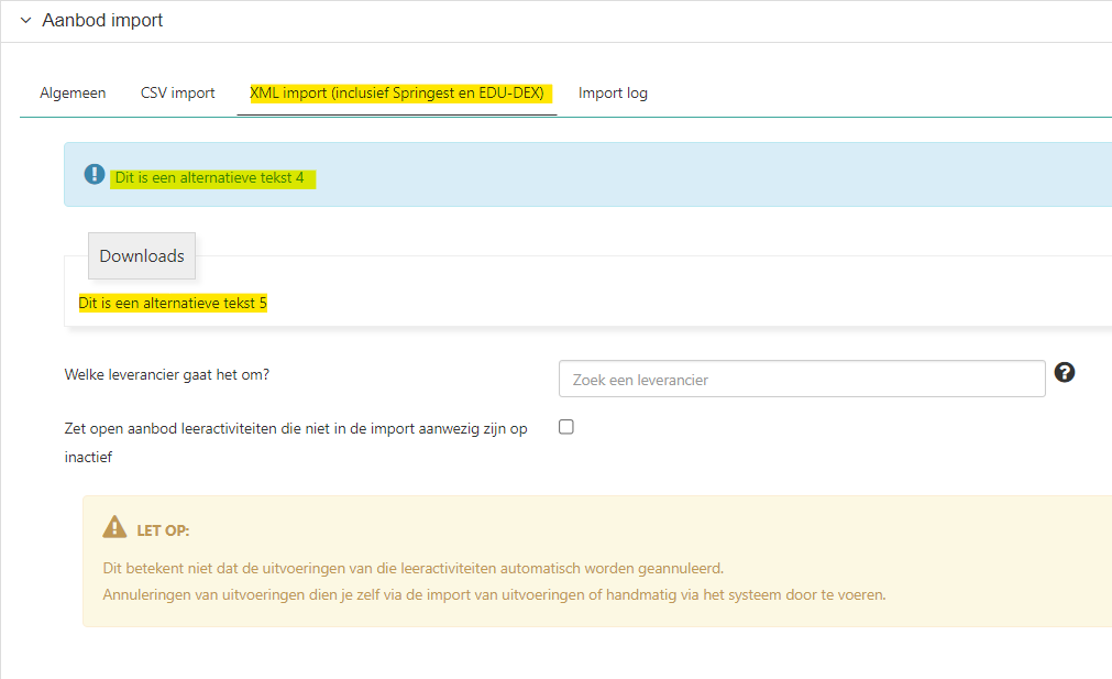 De alternatieve tekst wordt in het tabblad: ‘XML import (inclusief Springest en Edu-dex)’ bovenaan de pagina getoond in een blauwe balk.