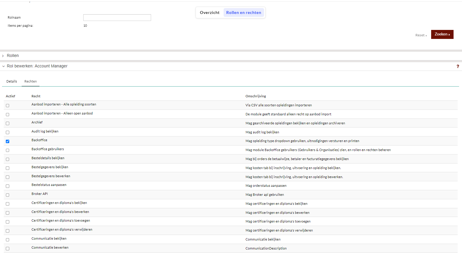 Als een recht gekoppeld moet worden aan de rol, dan kun je deze aanvinken onder ‘Actief’. Mocht er een recht niet meer nodig zijn, dan kan deze uitgevinkt worden.