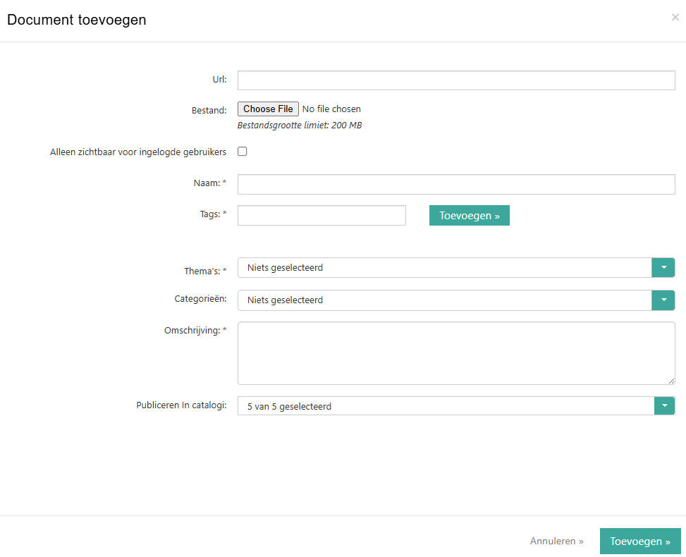 • Publiceren in catalogi: Selecteer hier de catalogus of de catalogi waarin het document/de video gepubliceerd moet worden.