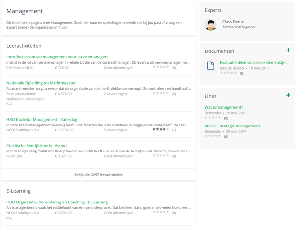 Op het kennisplein in het leerportaal zijn alle thema’s terug te vinden die door de organisatie gebruikt worden. Per thema is een themapagina beschikbaar. Deze biedt een overzicht van alle leeractiviteiten en e-learning die aan dit thema zijn gekoppeld. Daarnaast kunnen gebruikers zelf documenten, video’s en links met elkaar te delen en kunnen experts benaderd worden: