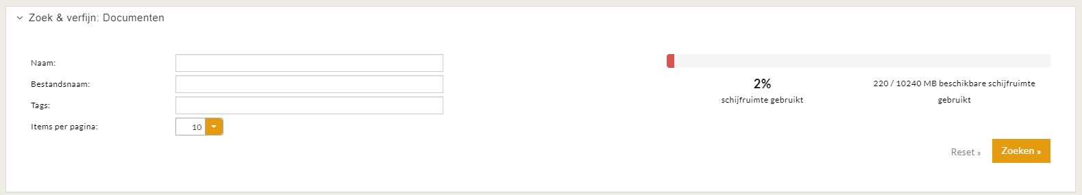 Naast de zoekfilters vind je een overzicht van de totale beschikbare schrijfruimte voor documenten en video’s en welk gedeelte hiervan al gebruikt is.