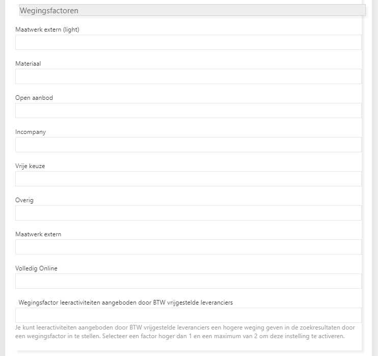 Op de nieuwe pagina zie je alle opleidingssoorten die er bekend staan in jouw Class portaal en backoffice. Om de weging aan te passen, vul je bij de gekozen opleidingssoort een getal in van 0 tot 2 in. Dit getal mag maximaal 2 decimalen bevatten.