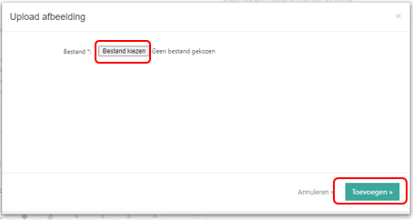 Een pop-up wordt getoond. In deze pop-up kun je de afbeelding toevoegen vanaf de map op jouw computer. Klik op ‘Bestand kiezen’ om het bestand op jouw computer te vinden. Klik hierna op ‘Toevoegen’. Het bestand wordt geüpload.
