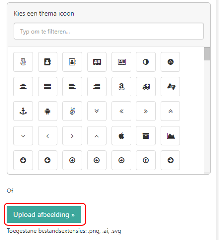 Een afbeelding kun je toevoegen door de klikken op ‘Upload afbeelding’. Deze optie is te vinden onder ‘Kies een thema icoon’. Let hierbij op dat enkel de afbeelding extensies PNG, AI of SVG toegestaan zijn.