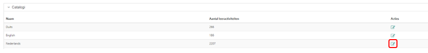 Op de nieuwe pagina kies je de Catalogus die je wilt bewerken. Je opent de catalogus door de klikken op ‘Acties: Bewerken’.