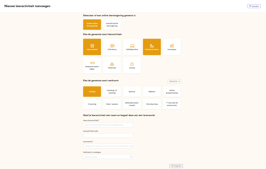 NB: Wanneer je een leeractiviteit toevoegt die volledig online is, dan wordt automatisch de werkvorm ‘e-learning’ gekoppeld. Indien er gebruik wordt gemaakt van de coachpagina, zorgt de werkvorm ‘coachprofiel’ ervoor dat de leeractiviteit op deze pagina komt te staan.