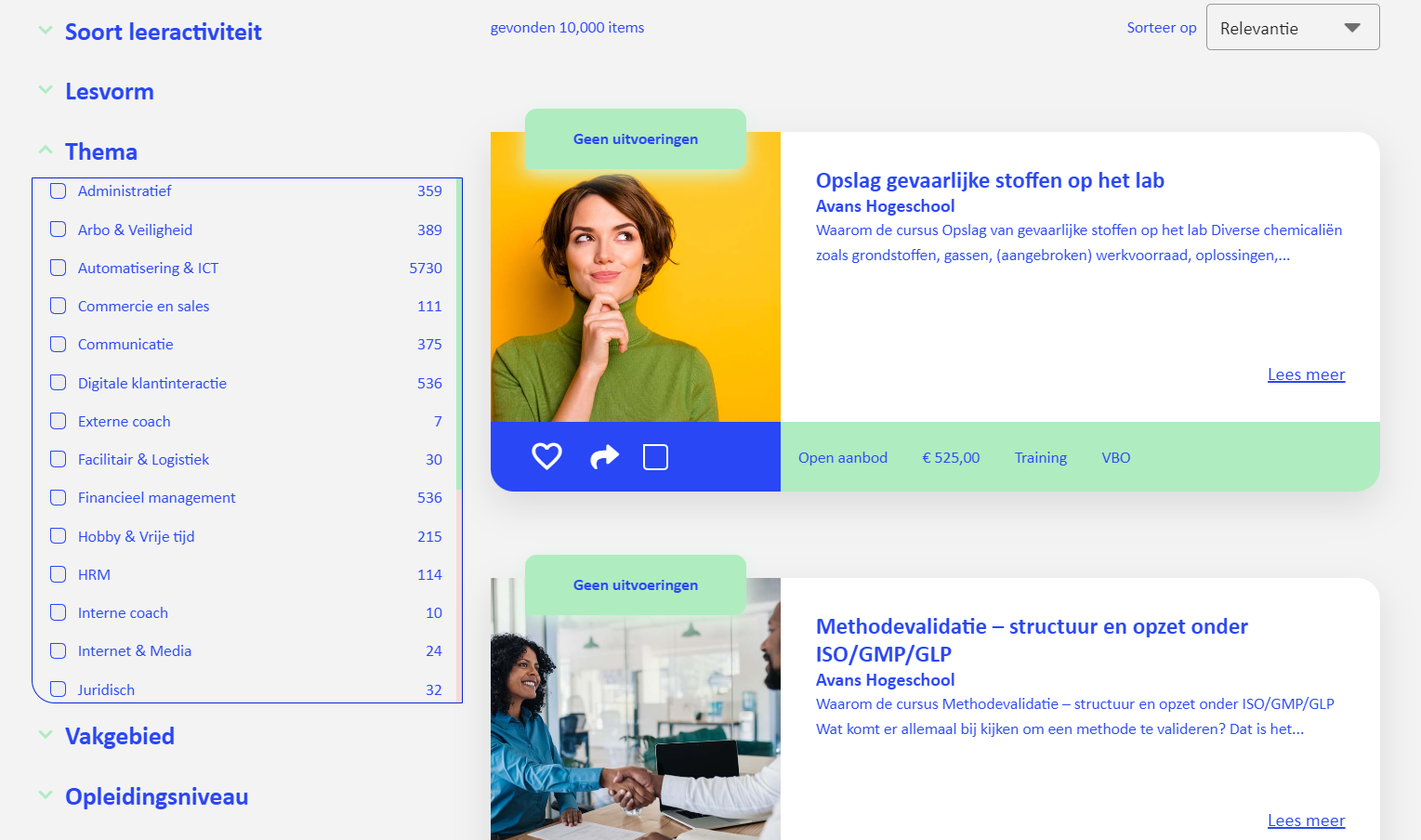 - Opleidingsniveau: Het minimale opleidingsniveau voor de leeractiviteit kun je ook als filteroptie toevoegen.