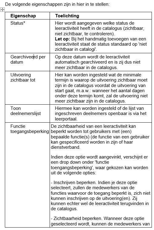 NB: Als een leeractiviteit is gepubliceerd in een catalogus, betekent dit niet direct dat deze ook zichtbaar is in de portal. Een leeractiviteit is pas in de catalogus te vinden wanneer deze is gepubliceerd in de catalogus én de status ‘zichtbaar in catalogi’ heeft.