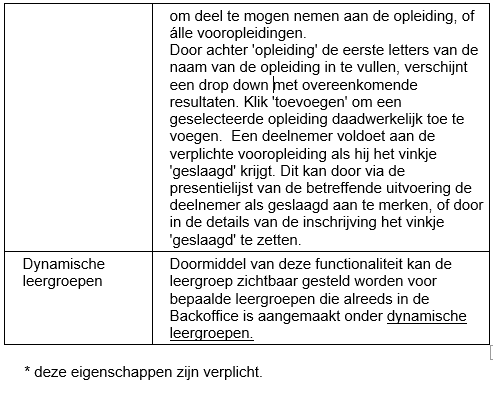 Hier kan worden aangegeven of er een vooropleiding of vooropleidingen voorde opleiding gelden. Met de optie ‘welke vooropleidingen zijn verplicht’ kan worden ingesteld of tenminste 1 van de vooropleidingen moet worden afgerond.