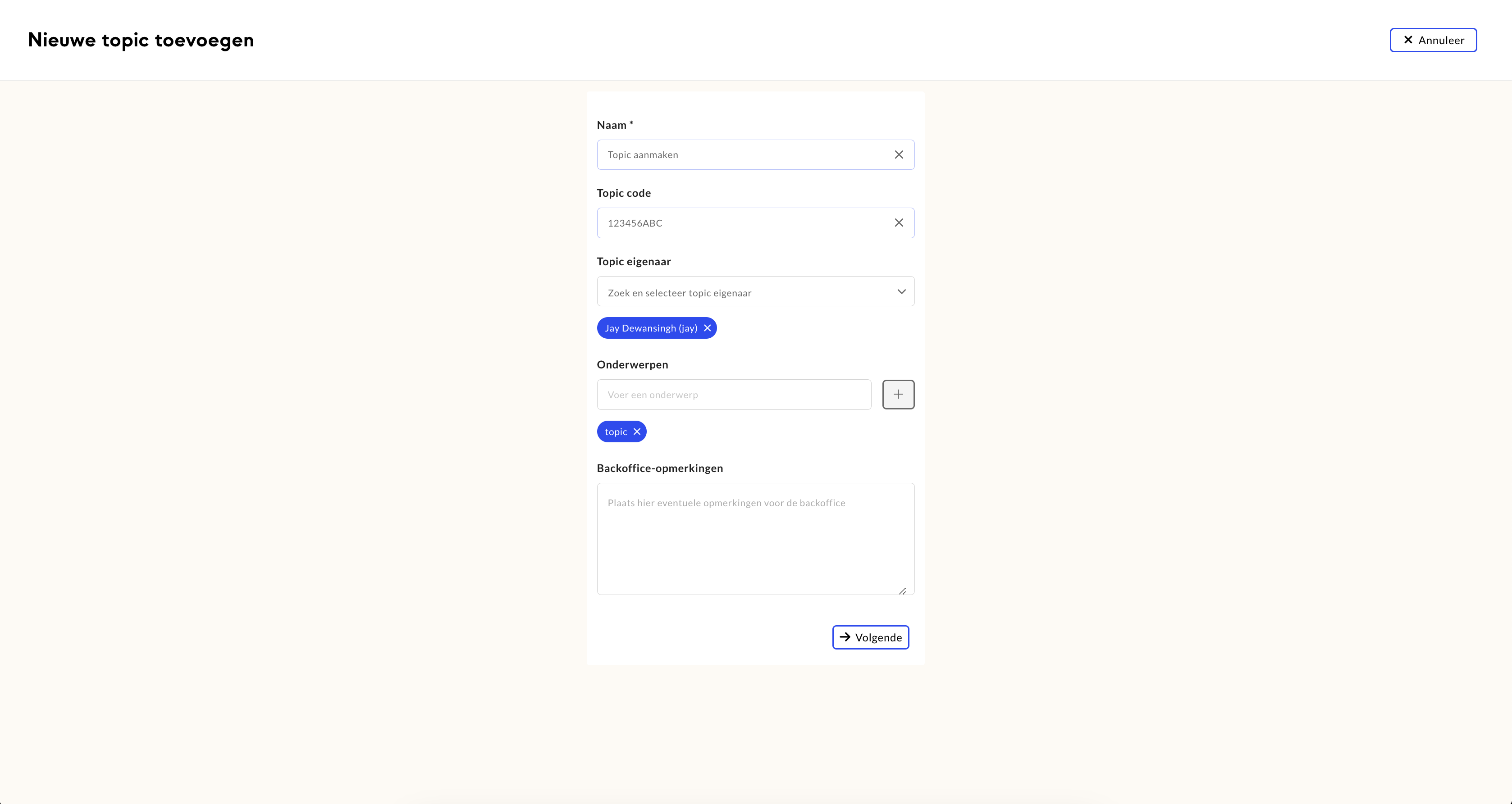 Voer de naam in van je topic en vul optioneel de overige invoervelden in. Klik vervolgens op ‘Volgende’.