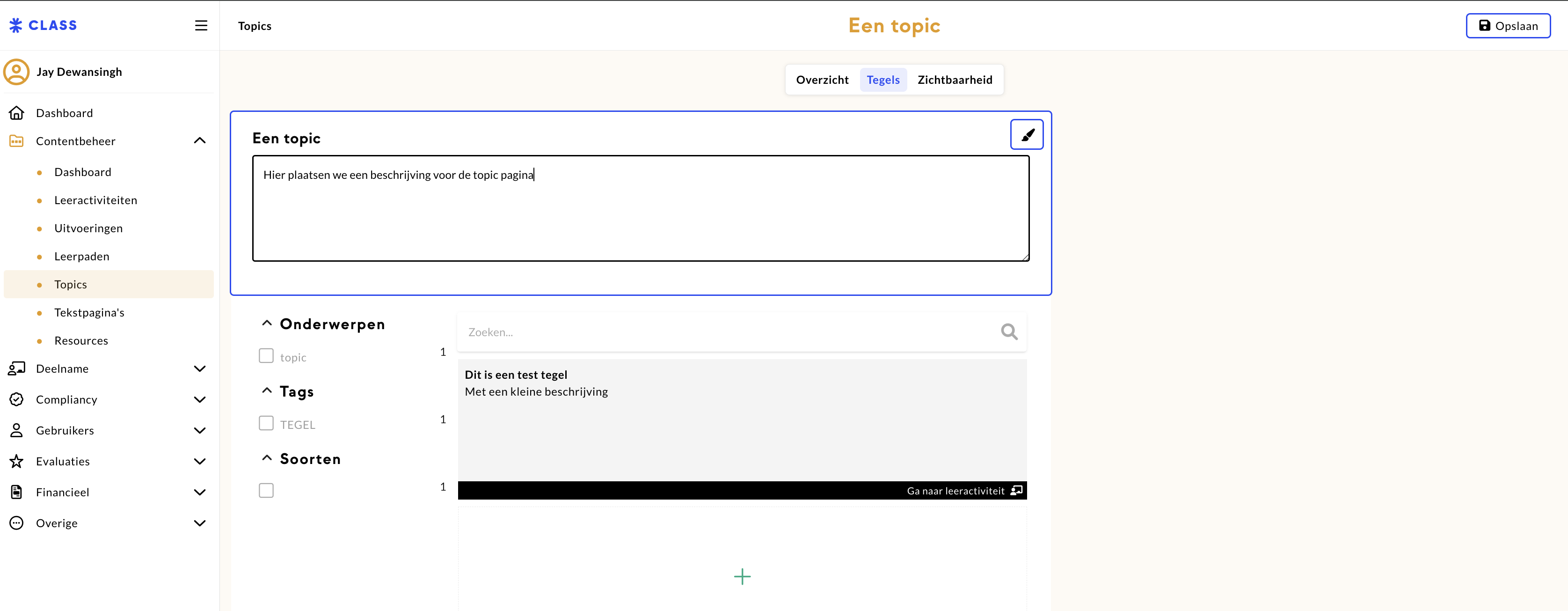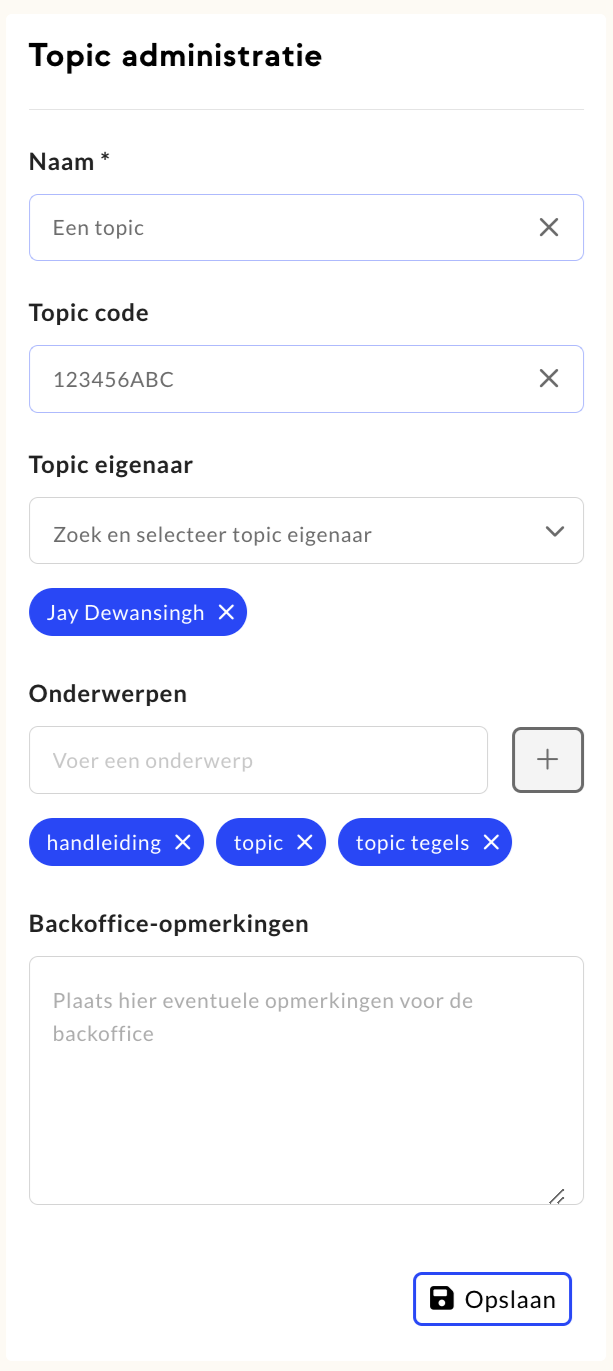 Om een onderwerp toe te voegen voer je de naam van de onderwerp in en klik je op de plus. Vervolgens klik je op ‘Opslaan’ om alle toevoegingen en wijzigingen binnen Topic administratie op te slaan.