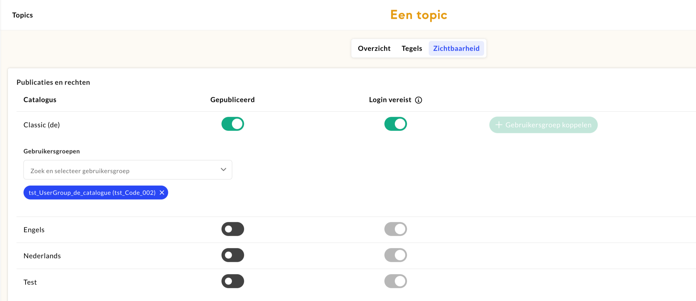 Om een gebruikersgroep te koppelen navigeer je naar tab ‘Zichtbaarheid’. Op de tab voor zichtbaarheid stel je de zichtbaarheid voor een topic in. Klik op de switch achter de catalogus om deze te publiceren (zwart=niet gepubliceerd / groen=gepubliceerd). Dit activeert automatisch dat de topic alleen te zien is voor een ingelogde gebruiker. Schakel deze optioneel uit als een topic openbaar is en zonder login te zien is.