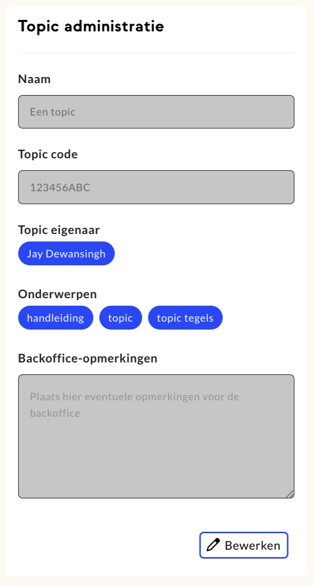 In de backoffice zie je echter de titel altijd blauw, dat wijkt dus af van hoe je het in het portaal ziet. De reden daarvoor is dat per catalogus de ingestelde kleur van headers verschillend kan zijn. Van de ene catalogus kan dat rood zijn, van de andere kan dat blauw zijn. In de backoffice kan daarom niet bepaald worden welke kleur getoond moet worden, omdat een topic tegel in meerdere catalogi gepubliceerd kan zijn. Daarom tonen we in de backoffice altijd blauw.