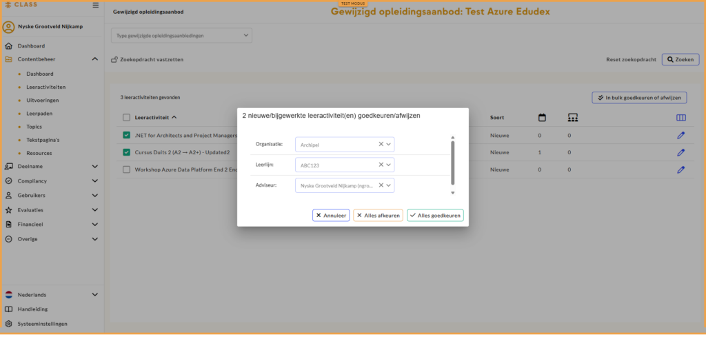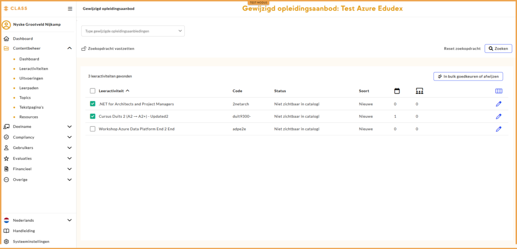 Wijzigingen en nieuwe leeractiviteiten van LMS gebruikers die het recht ‘wijzigingen in open aanbod goedkeuren’ hebben, worden automatisch goedgekeurd, mits er geen eerdere wijzigingen ter beoordeling openstaan. Is dit nog wel het geval, dan moeten zowel de bestaande als de nieuwe wijzigingen worden goedgekeurd via de module ‘gewijzigd opleidingsaanbod’.