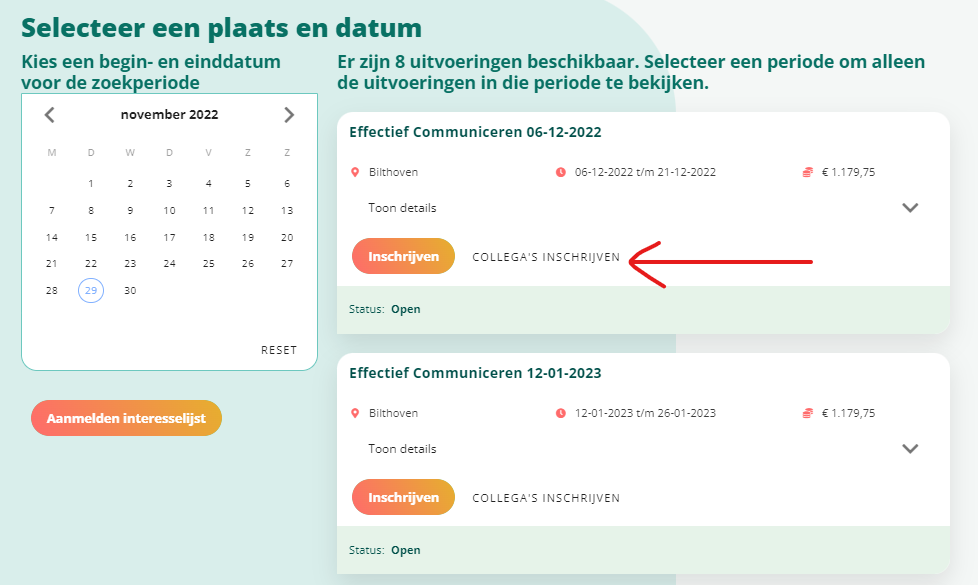 Of de knop ‘Collega’s inschrijven’ getoond wordt en voor welke collega’s je een groepsinschrijving mag doen, is tevens afhankelijk van de instelling ‘Groepsinschrijving toestaan’. Als daar ‘Geen groepsinschrijving’ is geselecteerd, dan verschijnt de knop niet.