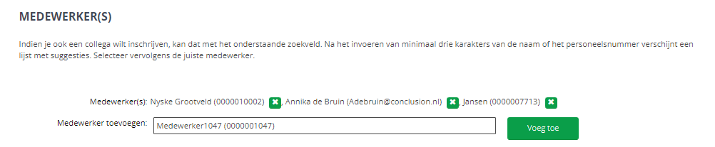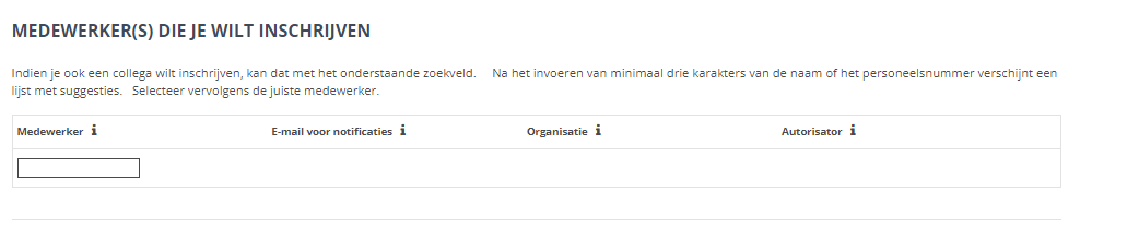 Als ‘Actief’ is aangevinkt en ‘Toon groepsinschrijving knop bij inschrijfformulier’ ook is aangevinkt, dan verschijnt op de opleidingsdetailpagina een knop ‘Collega’s inschrijven’. Als de gebruiker daarop klikt, dan wordt de volgende sectie getoond op het inschrijfformulier.