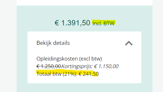 Toon BTW label Als deze optie aangevinkt is wordt op de leeractiviteitenpagina het label ‘inclusief BTW’ getoond achter de totaalprijs.