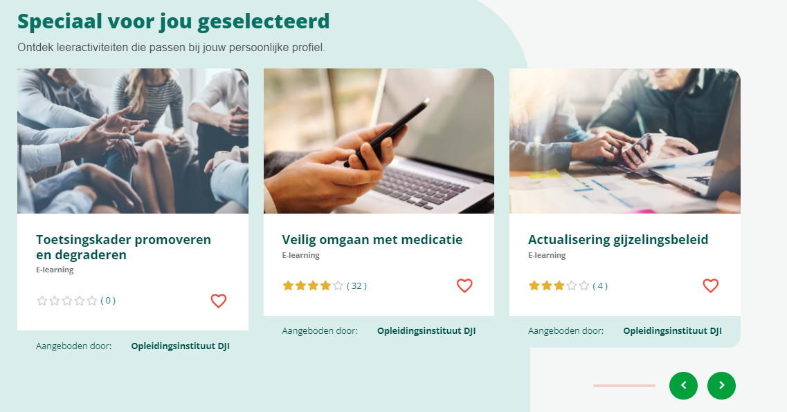Leeractiviteit 1 zal bovenaan de zoekresultatenlijst getoond worden, omdat deze volledig online is en ‘volledig online’ de hoogste wegingsfactor (1,8) heeft. Daaronder zal Leeractiviteit 3 worden getoond (wegingsfactor 1,4) en daar weer onder zal Leeractiviteit 2 worden getoond (wegingsfactor 1,3).
