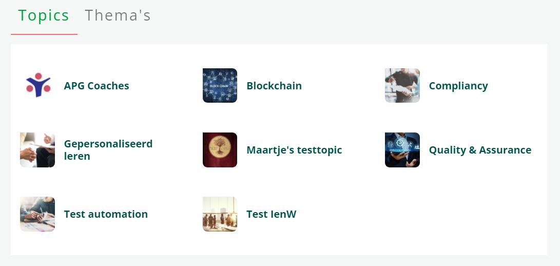 Als deze instelling aan staat, wordt op de homepage het blok Topics & Thema’s getoond. Je moet ook selecteren welke van de tabs je aan wilt zetten.