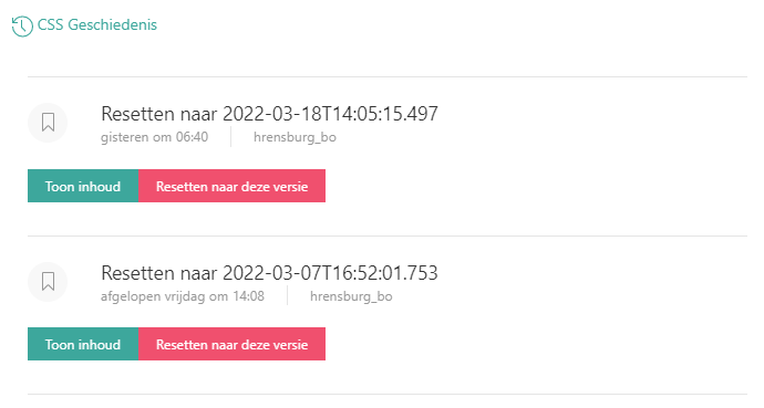 De CSS Geschiedenis kan de consultant van Conclusion Learning Centers gebruiken om terug te gaan naar een eerdere stylingversie, door de knop ‘Resetten naar deze versie’ te gebruiken.