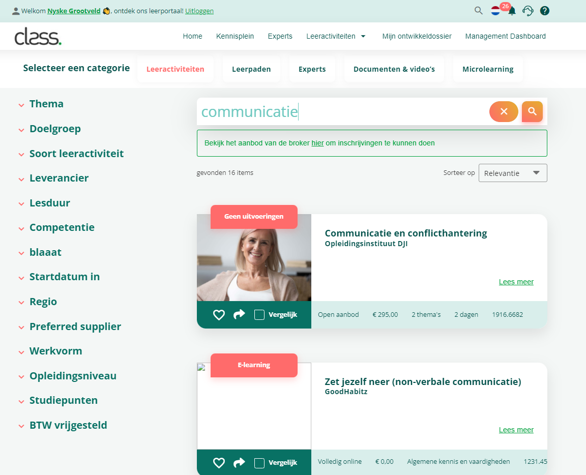 Er wordt gezocht door alle detailvelden van leeractiviteiten, experts, documenten en video’s, leerpaden en microlearning.