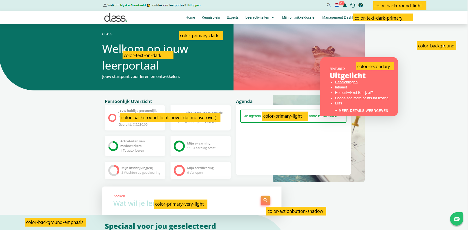 In onderstaande afbeelding zie je in gele balkjes de primaire- en secondaire kleuren die je kunt instellen, om de homepage aan te passen aan jouw huisstijl. Andere pagina’s maken ook gebruik van de ingestelde kleuren.