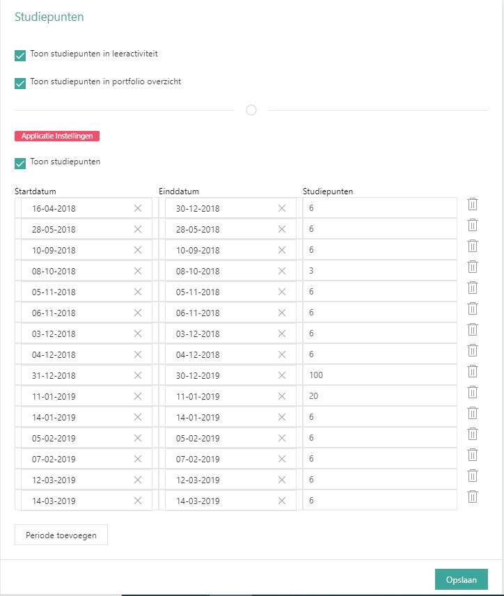 Hier zie je een overzicht van alle periodes die bij de applicatie-instellingen zijn ingesteld. Aan de rechterkant onder ‘studiepunten’ kun je, per periode, het aantal studiepunten invullen dat met deze leeractiviteit behaald kan worden. Let op: de studiepunten worden pas toegekend nadat de deelnemer de leeractiviteit succesvol heeft afgerond. Inschrijvingen kunnen bijvoorbeeld via de presentielijst worden afgerond.