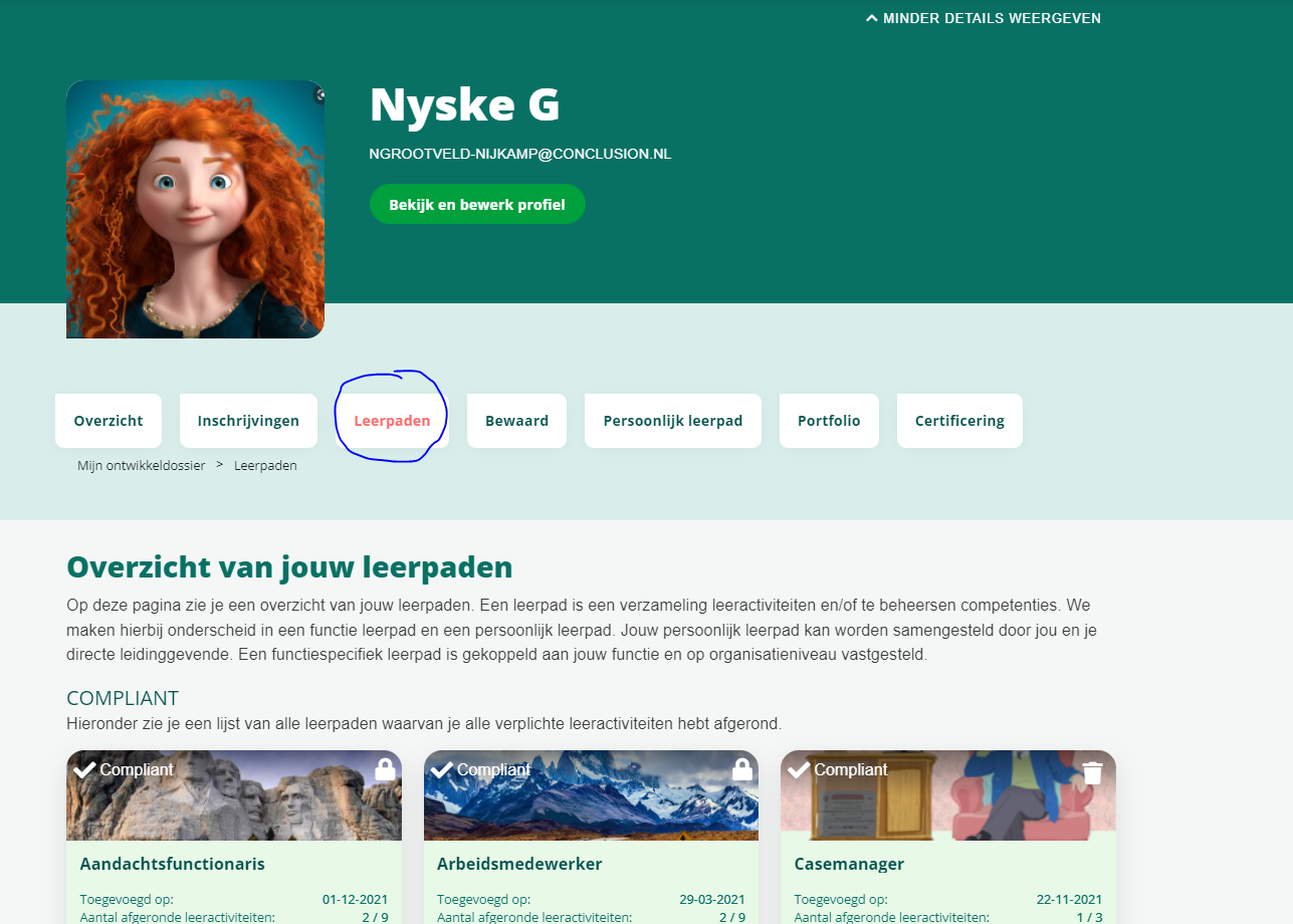 Als je deze instelling aan zet, dan is in het ontwikkeldossier een tabblad Leerpaden aanwezig. Op deze tab zijn de leerpaden zichtbaar waarop de medewerker is ingeschreven. De medewerker kan zichzelf inschrijven, maar een inschrijving kan ook automatisch zijn gedaan omdat de medewerker voldoet aan de criteria in een toewijzingsprofiel.