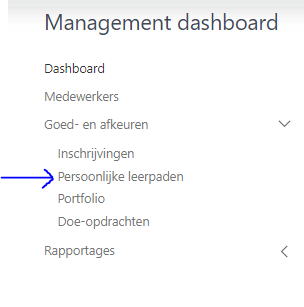 Het menu item is er niet als de instelling uit staat. In dat geval hoeft moet een persoonlijk leerpad dat een medewerker voor zichzelf (evt. samen met zijn leidinggevende) samenstelt, niet goedgekeurd worden door zijn directe leidinggevende.