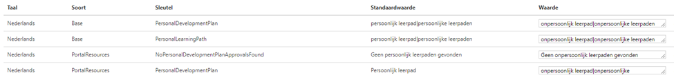 De term Leerpaden wordt ook op diverse plaatsen in de backoffice gebruikt. Je kunt de term ook voor de backoffice wijzigen. Filter in dit geval op Type ‘BOBase’ en sleutel ‘DevelopmentPlan’ en vul in het veld waarde de term in die in jullie organisatie gebruikt wordt. Vul zowel het enkelvoud als het meervoud van die term in, met een | ertussen. Bijvoorbeeld: ‘Ontwikkelpad|Ontwikkelpaden’.