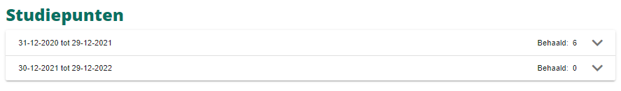 Als je deze instelling aan zet, dan verschijnt er in het ontwikkeldossier van de medewerker, op het tabblad Portfolio een kopje ‘Studiepunten’. Hier worden de behaalde studiepunten per periode getoond.