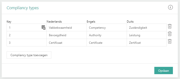 De typen complancy waarmee een organisatie werkt, kunnen hier ingericht worden. Als je alleen een Nederlandse catalogus hebt, is het niet nodig om ook de velden voor de andere talen te vullen.