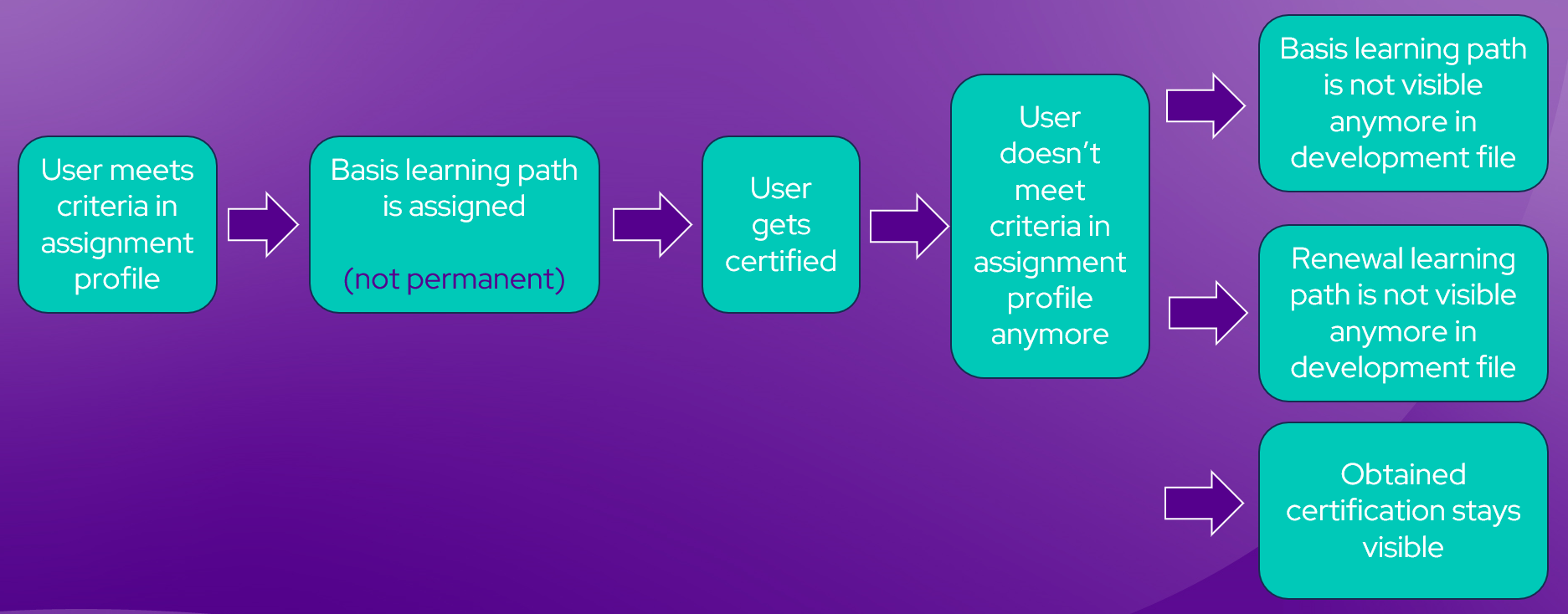Nadat certificering is ingericht voor het leerpad, zullen medewerkers die vanaf dat moment compliant worden op het leerpad de nacht erna een certificering ontvangen.