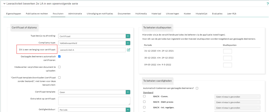 - Maak het jaar erna een nieuwe leeractiviteit aan die ook Leeractiviteit A heet. Het is belangrijk dat de nieuwe leeractiviteit dezelfde naam heeft. Zet geen jaartallen in de naam. Op het tabblad resultaten stel je bij “Dit is een verlenging voor certificaat” de oorspronkelijke (allereerste) leeractiviteit A in.