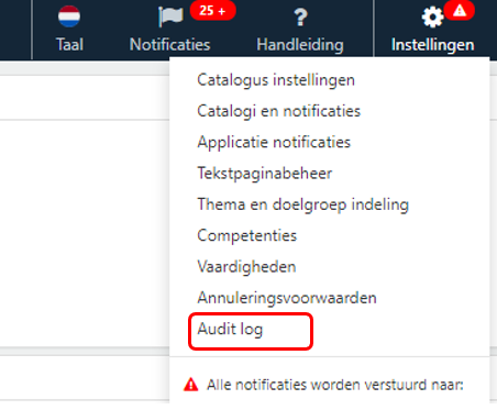 Om in de Audit logs te zoeken, ga je naar de audit log pagina. Je kunt navigeren naar de audit log pagina door te klikken op ‘Instellingen’ en vervolgens op ‘Audit log’. Als je deze regel niet kunt zien in het instellingen menu, dan heb je niet voldoende rechten om de audit logs te zien.