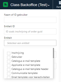 Selecteer hier de entiteit waar je alle wijzigingen van wilt zien. Dat kan zijn een inschrijving, gebruiker, diverse soorten e-mail en communicatie templates, opleidings- of uitvoeringsprijs, order, order item regel, applicatie- of catalogusinstelling, servicekosten, leveranciersbeoordeling, rol, gebruikersautorisatie, tekstpagina of certificaat.